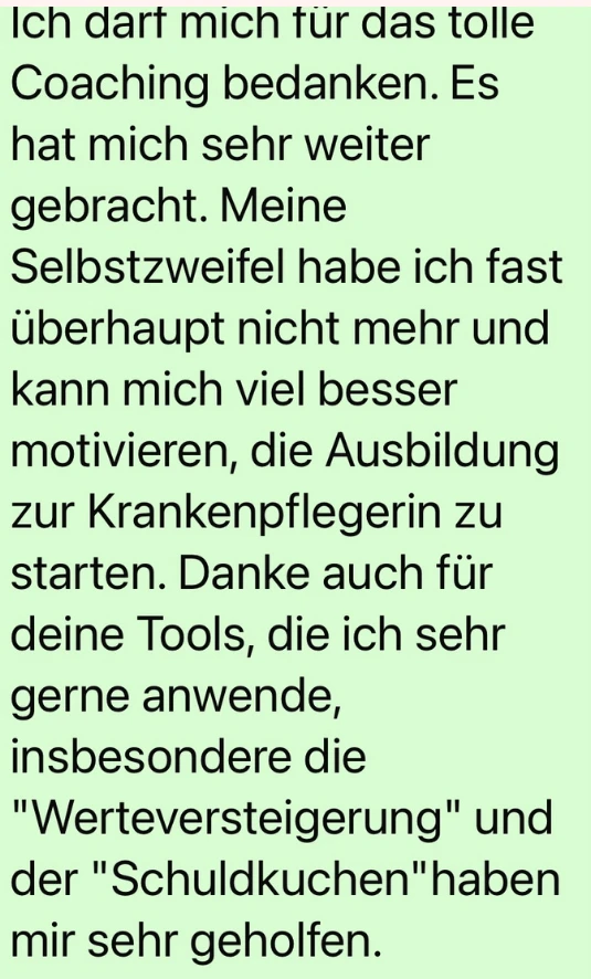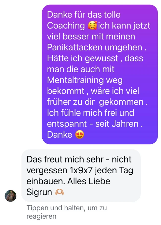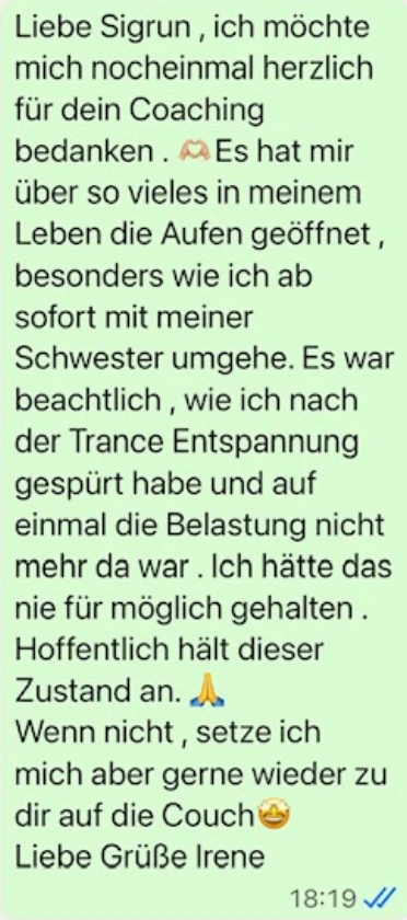 Liebe Sigrun , ich möchte mich nocheinmal herzlich für dein Coaching bedanken . 🫶🏼Es hat mir über so vieles in meinem Leben die Augen geöffnet , besonders wie ich ab sofort mit meiner Schwester umgehe. Es war beachtlich , wie ich nach der Trance Entspannung gespürt habe und auf einmal die Belastung nicht mehr da war . Ich hätte das nie für möglich gehalten .
